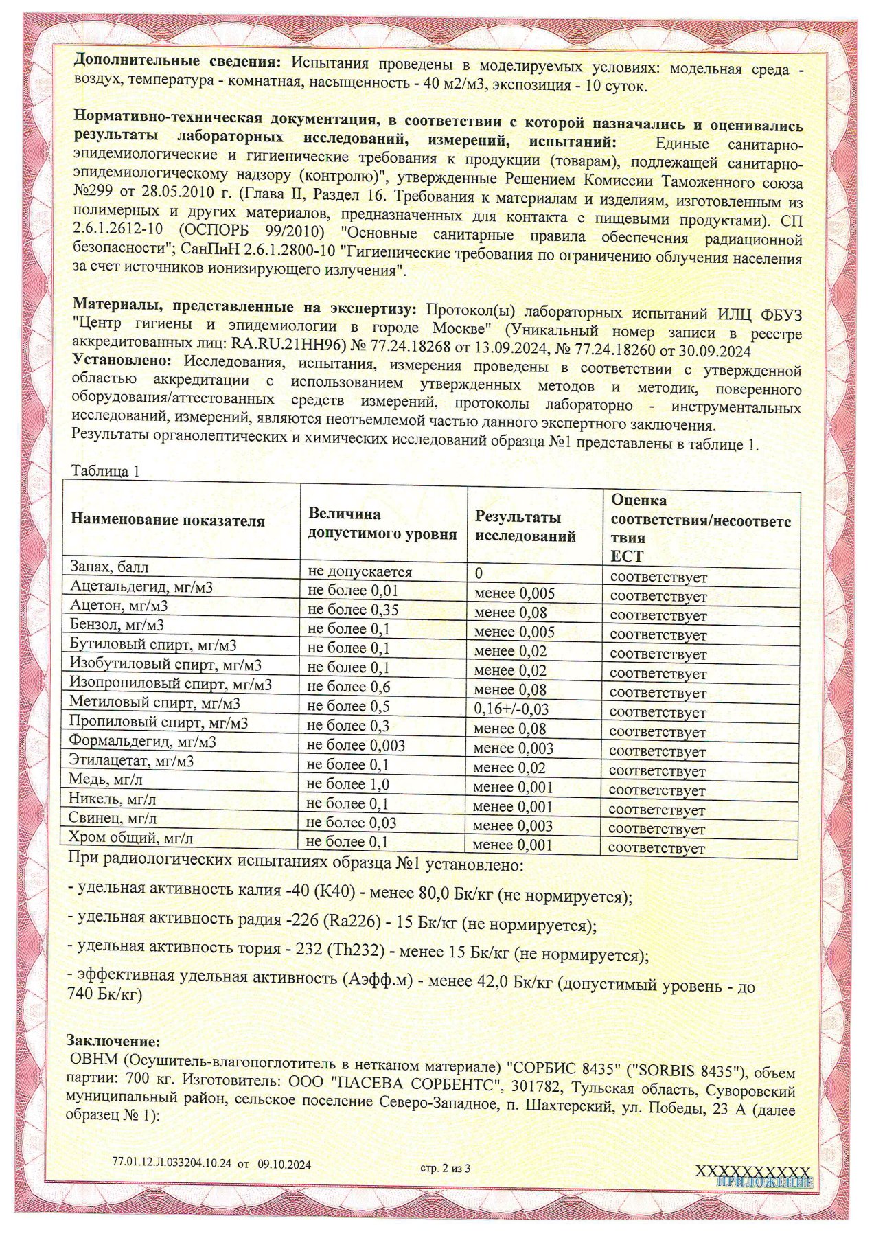 Заключение: ОВНМ (Осушитель-влагопоглотитель в нетканом материале) "СОРБИС 8435" ("SORBIS 8435"), объем партии: 700 кг. Изготовитель: ООО "ПАСЕВА СОРБЕНТС": по органолептическому (интенсивность запаха), санитарно-химическим показателям (миграция в воздушную среду ацетальдегида, ацетона, бензола, бутилового спирта, изобутилового спирта, изопропилового спирта, метилового спирта, пропилового спирта, формальдегида, этилацетата, меди, никеля, свинца, хрома общего) соответствует Единым санитарно-эпидемиологическим и гигиеническим требованиям к продукции (товарам), подлежащие санитарно - пидемиологическому надзору (контролю), утв. Решением Комиссии Таможенного союза от 28 мая, 2010 года № 299 (Глава II Раздел 16 Требования к материалам и изделиям, изготовленным из полимерных и других материалов, предназначенных для контакта с пищевыми продуктами)). Установленное значений эффективной удельной активности природных радионуклидов (ПРН) соответствует требованиям п. 5.2.5 СП 2.6.1.2612-10 (ОСПОРБ 99/2010) "Основные санитарные правила обеспечения радиационной безопасности" и п. 4.5.2.СанПиН 2.6.1.2800-10 "Гигиенические требования по ограничению облучения населения за счет источников ионизирующего излучения".